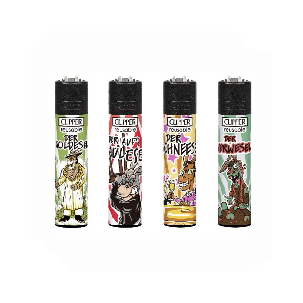 Gebinde besteht aus 4 Clipper Sorten mit den abgebildeten Motiven und enthält insgesamt 48 Stück Feuerzeuge.