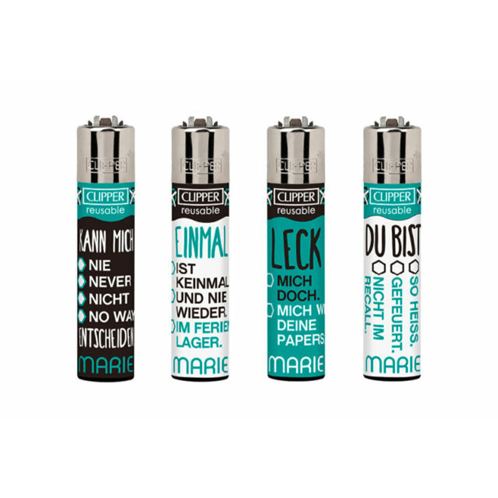 Gebinde besteht aus 4 Clipper Sorten mit den abgebildeten Motiven und enthält insgesamt 48 Stück Feuerzeuge.
