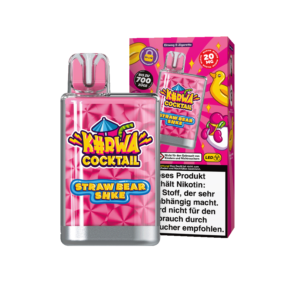 Die Einweg Shisha aus der Kurwa Cocktail Kollektion im leckeren Erdbeere-Milchshake-Aroma. Eine moderne, schlanke und dynamische Form gepaart mit einem unglaublich intensiven Geschmack, runden das Erlebnis vollständig ab. Zusätzlich besitzt das Gerät eine 3-Zugautomatik Kindersicherung. Die Funktion wird durch Drei kurze und schnelle Puffs aktiviert bzw. deaktiviert. Der Akku bietet eine Kapazität von mehr als 700 Zügen, das knapp 3,5 Packungen Zigaretten entspricht. Mit einem LED-Licht ausgestattet, zieht die E-Shisha noch mehr Aufmerksamkeit auf sich.