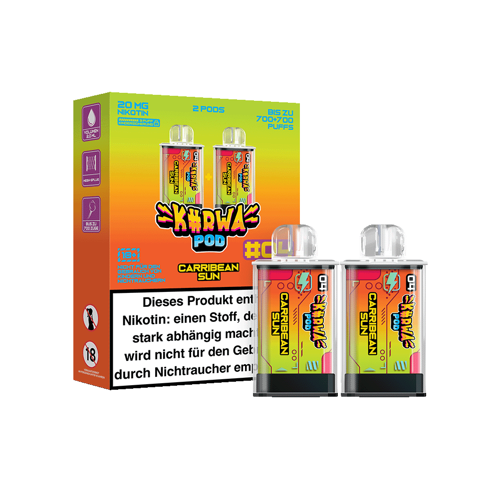 Das Kurwa Pod Nachfüll-Kit beinhaltet 2 vorgefüllte Pods mit jeweils 2 ml Liquid und der Geschmacksrichtung Nr.4 Carribean Sun: Mango-Guave. Sobald der Akku erschöpft ist, kann dieser aufgeladen und mit einem neuen oder alten Pod (sofern Inhalt vorhanden) wiederverwendet werden.