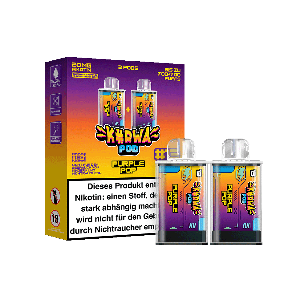Das Kurwa Pod Nachfüll-Kit beinhaltet 2 vorgefüllte Pods mit jeweils 2 ml Liquid und der Geschmacksrichtung Nr.13 Purple Pop: Traubensaft-Limonade. Sobald der Akku erschöpft ist, kann dieser aufgeladen und mit einem neuen oder alten Pod (sofern Inhalt vorhanden) wiederverwendet werden.