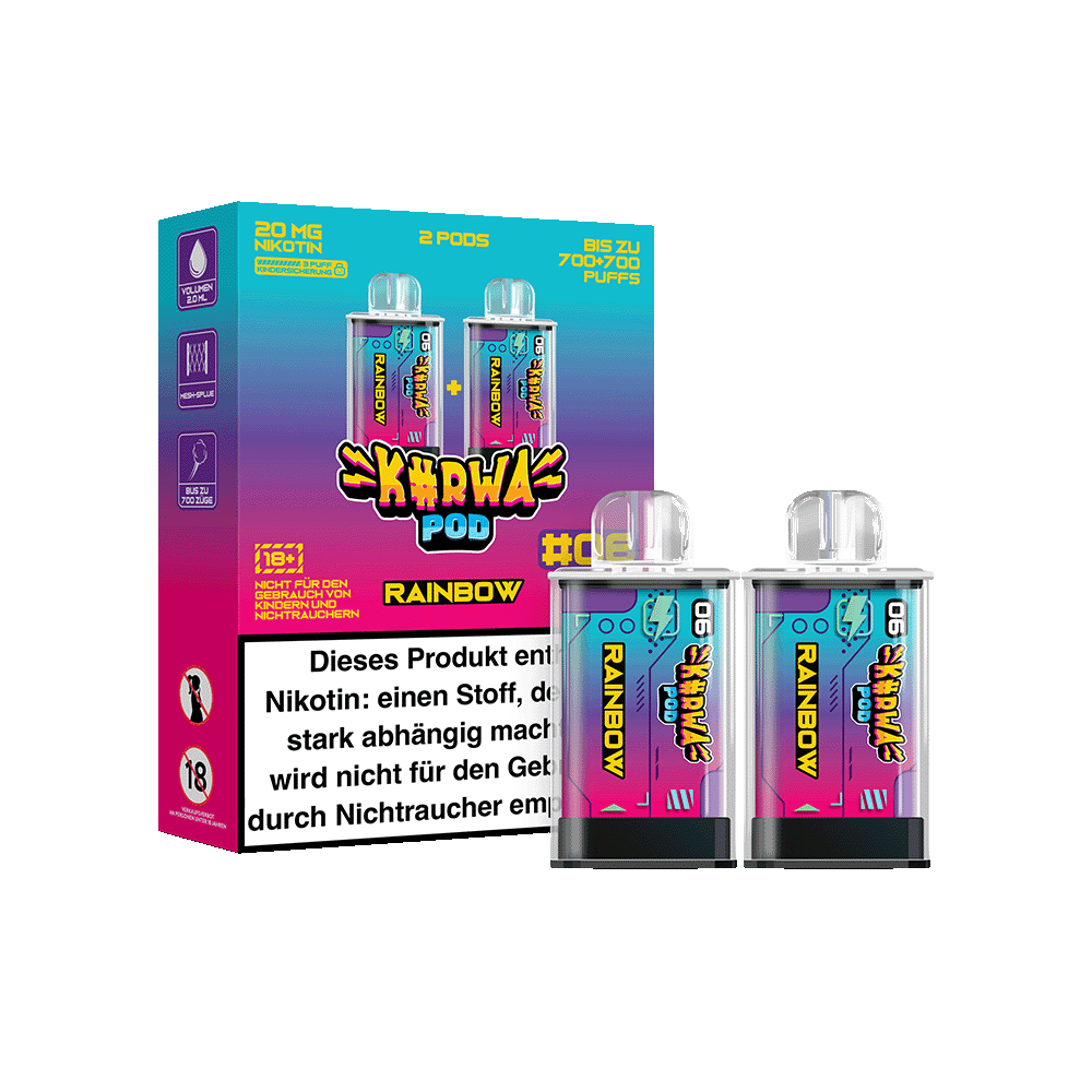 Das Kurwa Pod Nachfüll-Kit beinhaltet 2 vorgefüllte Pods mit jeweils 2 ml Liquid und der Geschmacksrichtung Nr. 6 Rainbow: Skittles. Sobald der Akku erschöpft ist, kann dieser aufgeladen und mit einem neuen oder alten Pod (sofern Inhalt vorhanden) wiederverwendet werden.