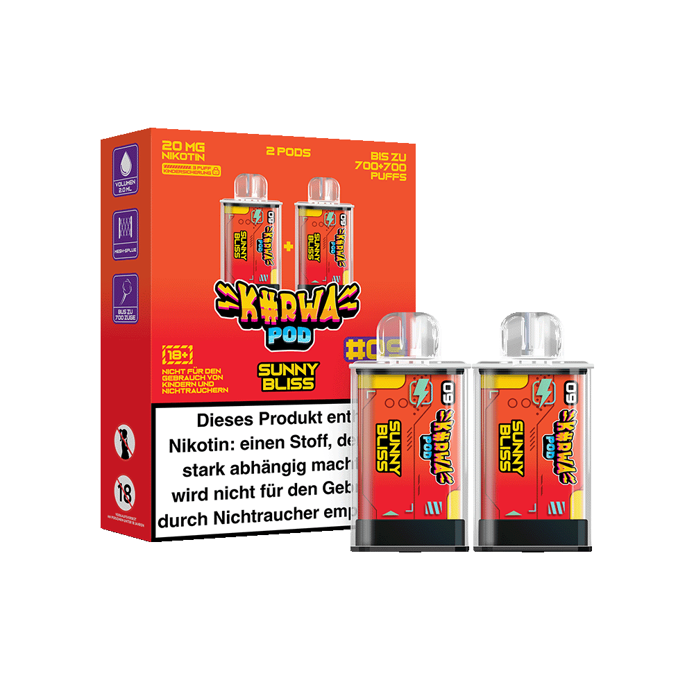 Das Kurwa Pod Nachfüll-Kit beinhaltet 2 vorgefüllte Pods mit jeweils 2 ml Liquid und der Geschmacksrichtung Nr.9 Sunny Bliss: Mango-Orange. Sobald der Akku erschöpft ist, kann dieser aufgeladen und mit einem neuen oder alten Pod (sofern Inhalt vorhanden) wiederverwendet werden.