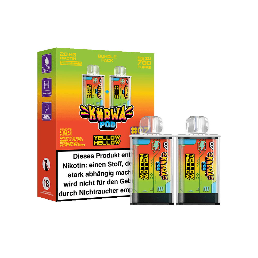 Das Kurwa Pod Nachfüll-Kit beinhaltet 2 vorgefüllte Pods mit jeweils 2 ml Liquid und der Geschmacksrichtung Nr. 7 Yellow Mellow: Wassermelone-Honigmelone. Sobald der Akku erschöpft ist, kann dieser aufgeladen und mit einem neuen oder alten Pod (sofern Inhalt vorhanden) wiederverwendet werden.