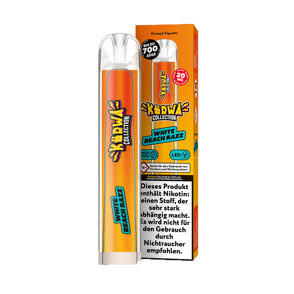 Dieser LED-Licht Kurwa Vape-Pen, oder auch E- Shisha genannt, ist im extrem fruchtigen White Peach-Raspberry Geschmack erhältlich. Die E- Shishas werden in Kooperation mit dem bekannten Produzenten Reymont hergestellt und erfreuen sich aufgrund der enormen Qualität, großer Beliebtheit. Eine schlanke, dynamische Form und ein Drahtgeflecht im inneren, sorgen für eine starke Dampfentwicklung und intensives Shisha-Erlebnis. Der Akku bietet eine Kapazität von mehr als 700 Zügen, das knapp 3,5 Packungen Zigaretten entspricht. Mit einem LED-Licht ausgestattet, zieht die E-Shisha noch mehr Aufmerksamkeit auf sich. Der entscheidende Vorteil ist, dass die E- Shisha keine Verbrennungsrückstände hinterlässt, nicht aufgeladen werden muss und sofort einsatzbereit ist. Daher tragen die Kurwa-Vape auch zahlreiche Bezeichnungen, wie Einweg Vape, Vape Stick, E Shisha und sogar e Zigarette.